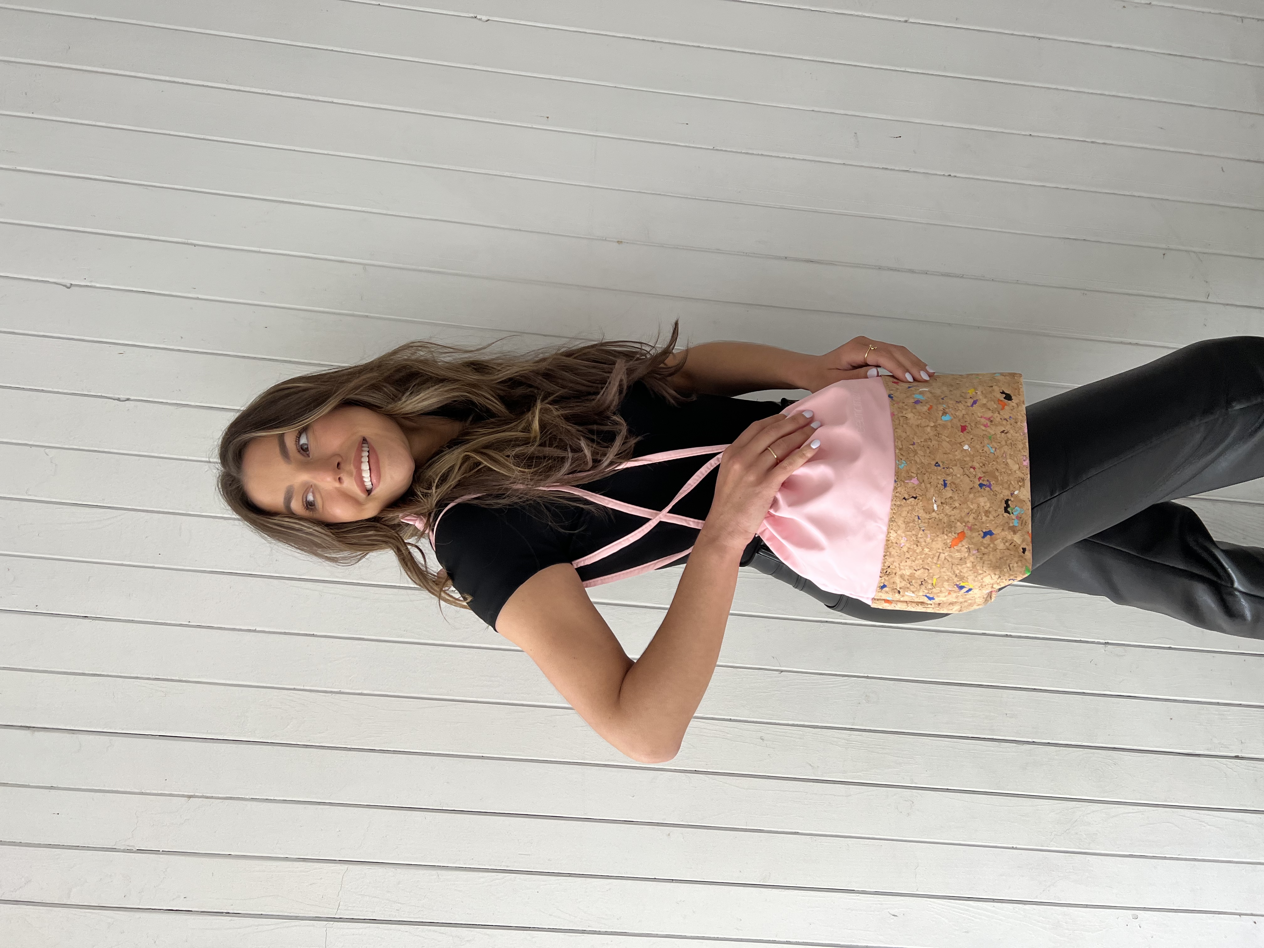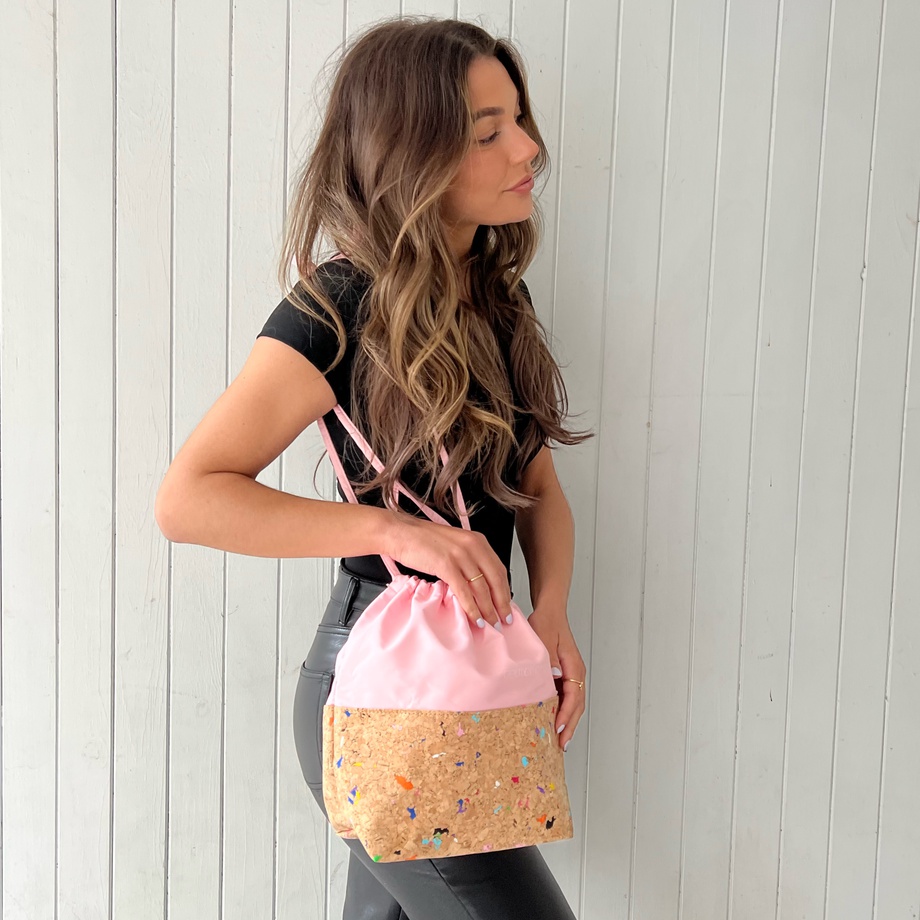 GelMoment’s Cork Drawstring Bag is as sturdy as it is stylish. Tote around your smaller essentials in this perfectly sized and uniquely designed drawstring bag. You have two colour schemes to choose from: cork base with multicolour speckles, pale pink vinyl upper body, and white GelMoment logo; or cork base with gold speckles, black vinyl upper body, and golden GelMoment logo.