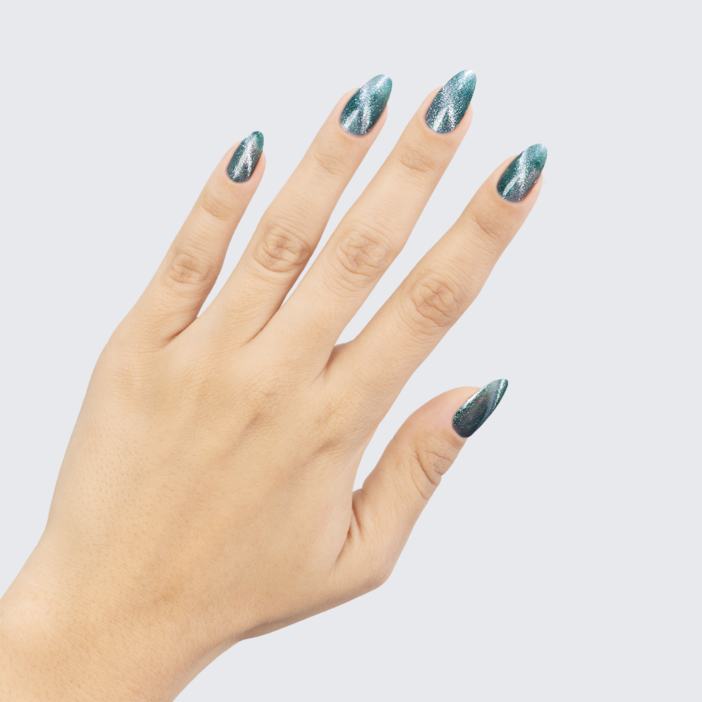 Teal. Dark. Silvery teal magnetic shimmer. Opaque. Cool undertone.