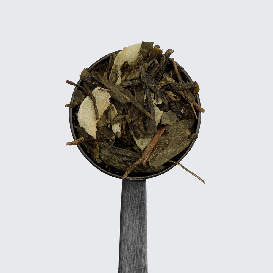 Sencha green tea, coconut chips, coconut extract, carrots, cornflower.